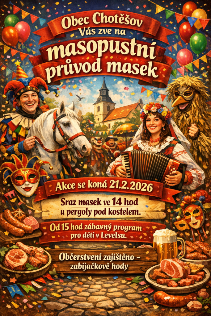Obec Chotěšov Vás srdečně zve na masopustní průvod masek, který se uskuteční v sobotu 21. 2. 2026 od 14:00 hod.