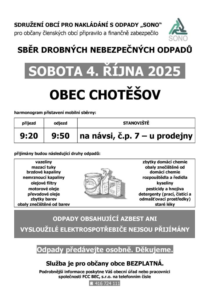 Sdružení obcí pro nakládání s odpady „SONO“ pořádá sběr drobných nebezpečných odpadů pro občany obce Chotěšov. Akce se bude konat v sobotu 4. října 2025 v obci Chotěšov. Mobilní sběrna bude přistavena na návsi před prodejnou potravin od 9:20 do 9:50 hod. Budou přijímány různé druhy nebezpečných odpadů, jako jsou motorové oleje, brzdové kapaliny, zbytky domácí chemie a další nebezpečné odpady uvedené na přiloženém letáku. Služba je pro občany zdarma.